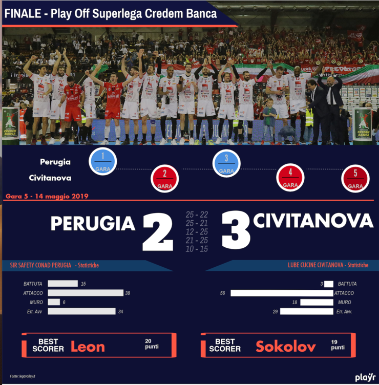 La Lube batte 3-2 in gara 5 la Sir Safety Conad Perugia in una finale imprevedibile.