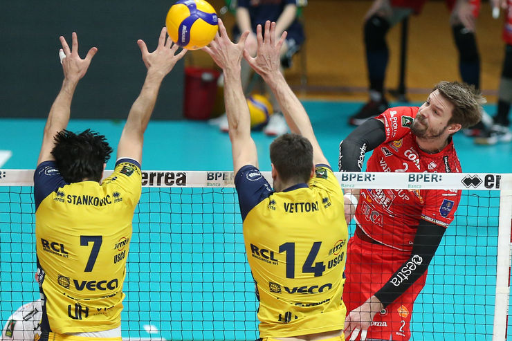 NOTE: Modena: bs 19, ace 3, muri 3, 46% in ricezione (29% perfette), 49% in attacco. Lube: bs 18, ace 6, muri 11, 49% in ricezione (31% perfette), 48% in attacco.